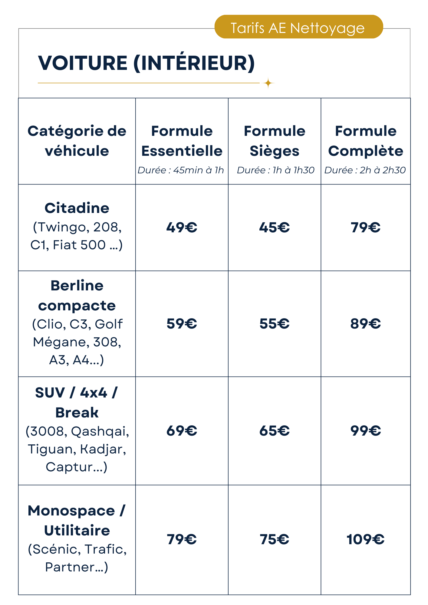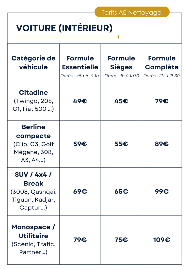 Les suppléments sont indiqués avant la prestation, après évaluation du véhicule.
